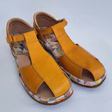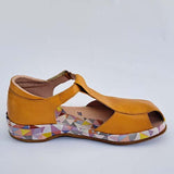 beautiful sandal with closed heel and velcro closing. Made on an orthopedic last for extreme comfort. Printed leather coated sole